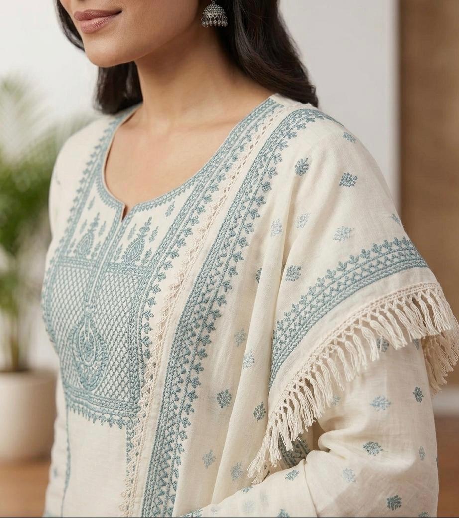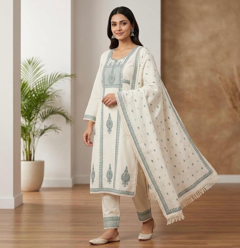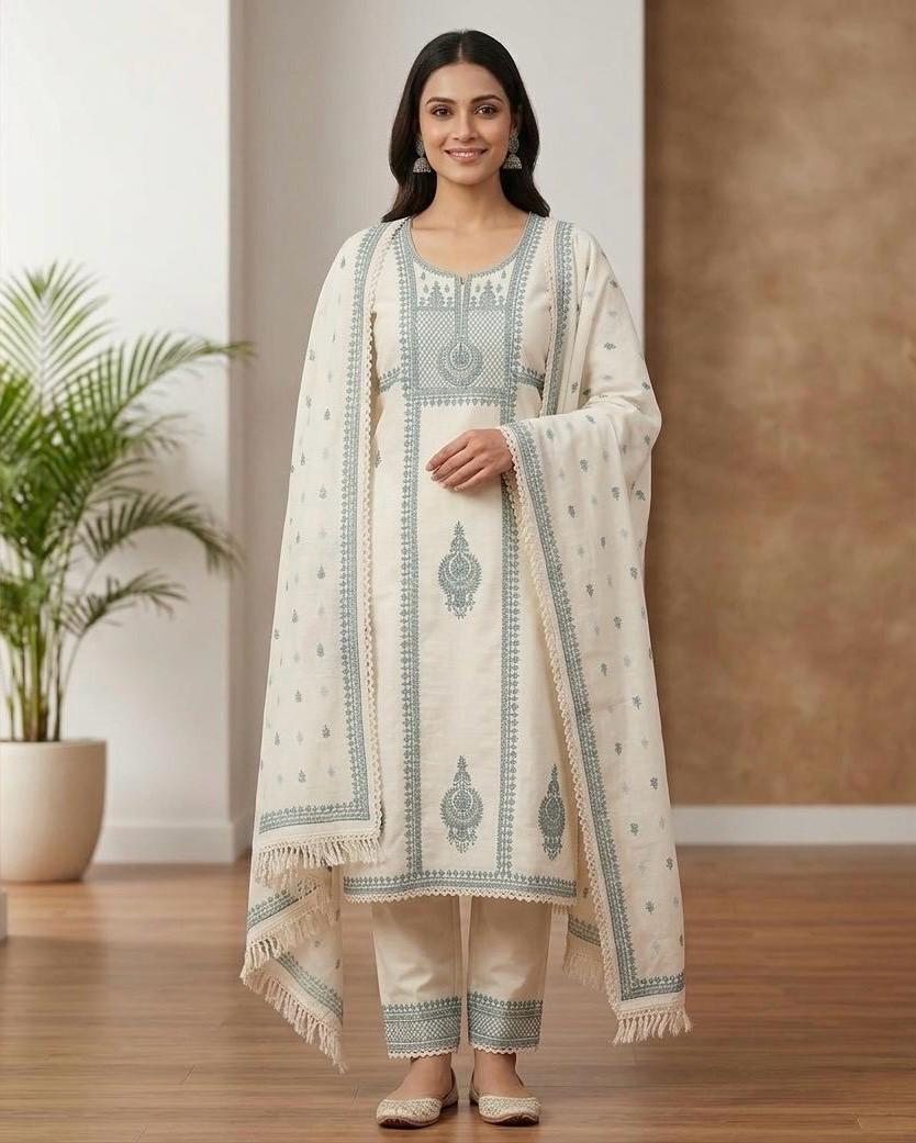 Elevate your seasonal wardrobe with this exquisitely crafted three-piece ensemble, designed for the woman who appreciates a blend of traditional artistry and contemporary silhouettes. This ivory-based set features intricate, multi-colored floral embroidery that brings a soft, artistic charm to a classic look.