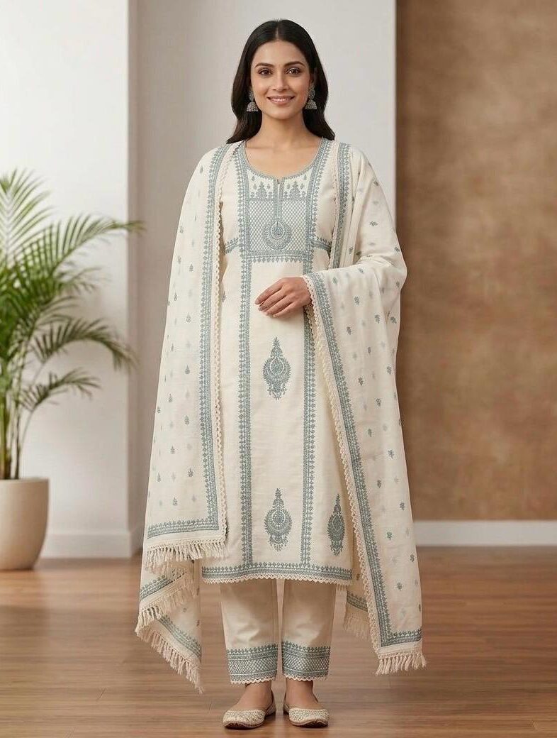 Elevate your seasonal wardrobe with this exquisitely crafted three-piece ensemble, designed for the woman who appreciates a blend of traditional artistry and contemporary silhouettes. This ivory-based set features intricate, multi-colored floral embroidery that brings a soft, artistic charm to a classic look.